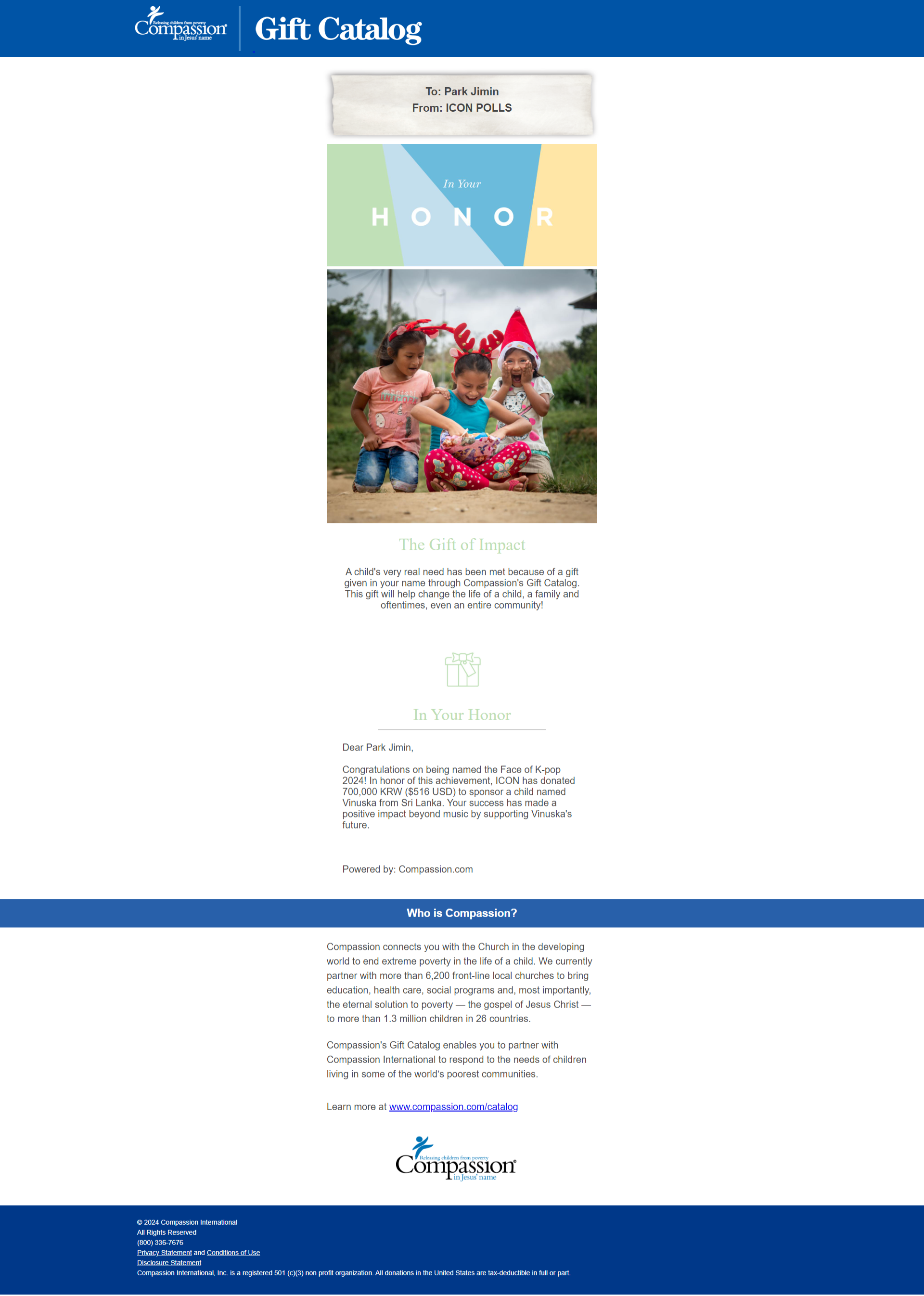 Congratulations to Park Jimin! As the winner, a generous donation of 700,000 Korean Won (approximately $516 USD) has been made in his honor to sponsor a child in need for a full year. This contribution will go to the reputable charity organization, COMPASSION, to support Vinuska, a child from Sri Lanka.
